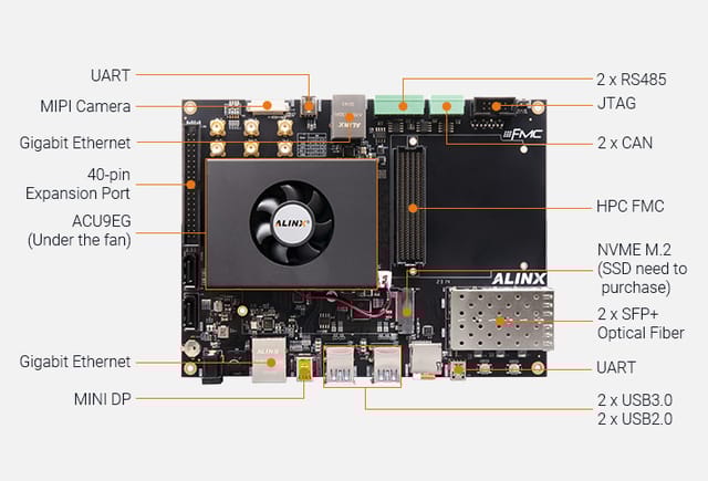 The AXU9EGB/15EGB development board equipped with the AMD/Xilinx Zynq™ UltraScale+™ MPSoC-series device, delivers standout performance with fast DDR4 SDRAM, eMMC Flash, QSPI Flash, FMC HPC, DP, M.2.